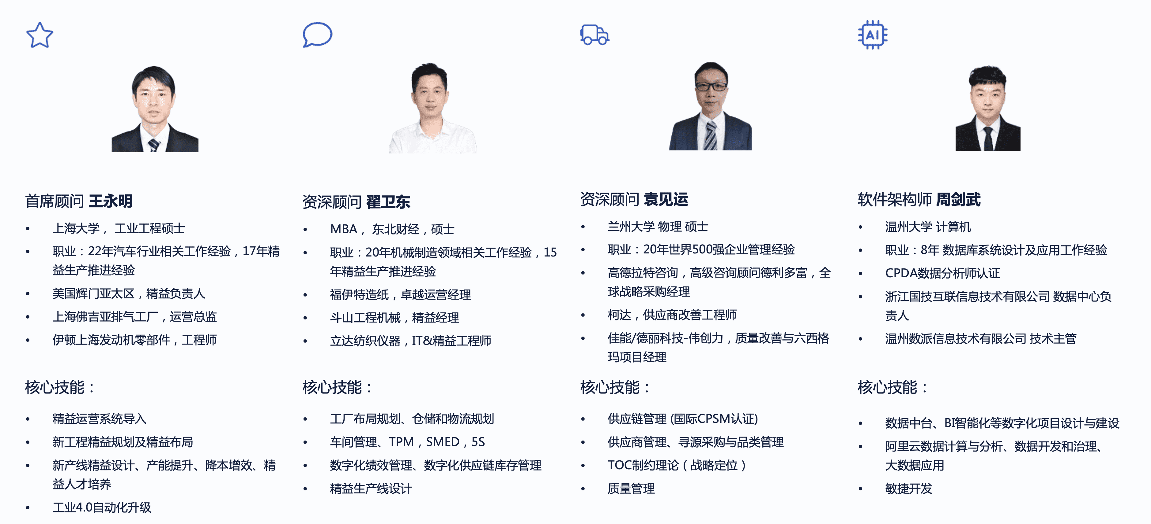 我们的顾问均拥有德国顶级咨询公司背景,并具备10年以上实战经验,深谙各行业痛点与解决之道;覆盖汽车、电子、机械等多个制造业领域,能快速理解并解决不同行业的特定问题。